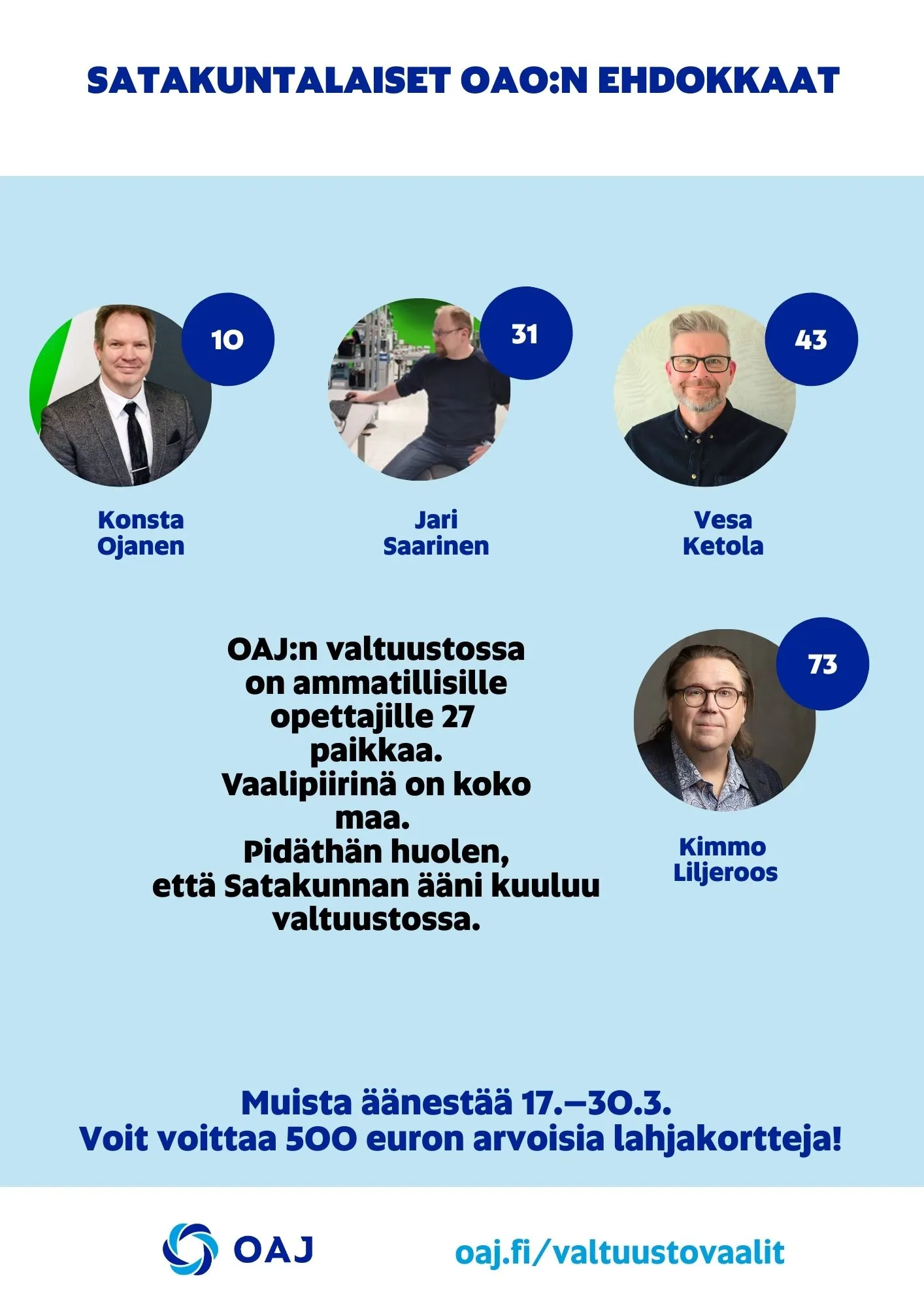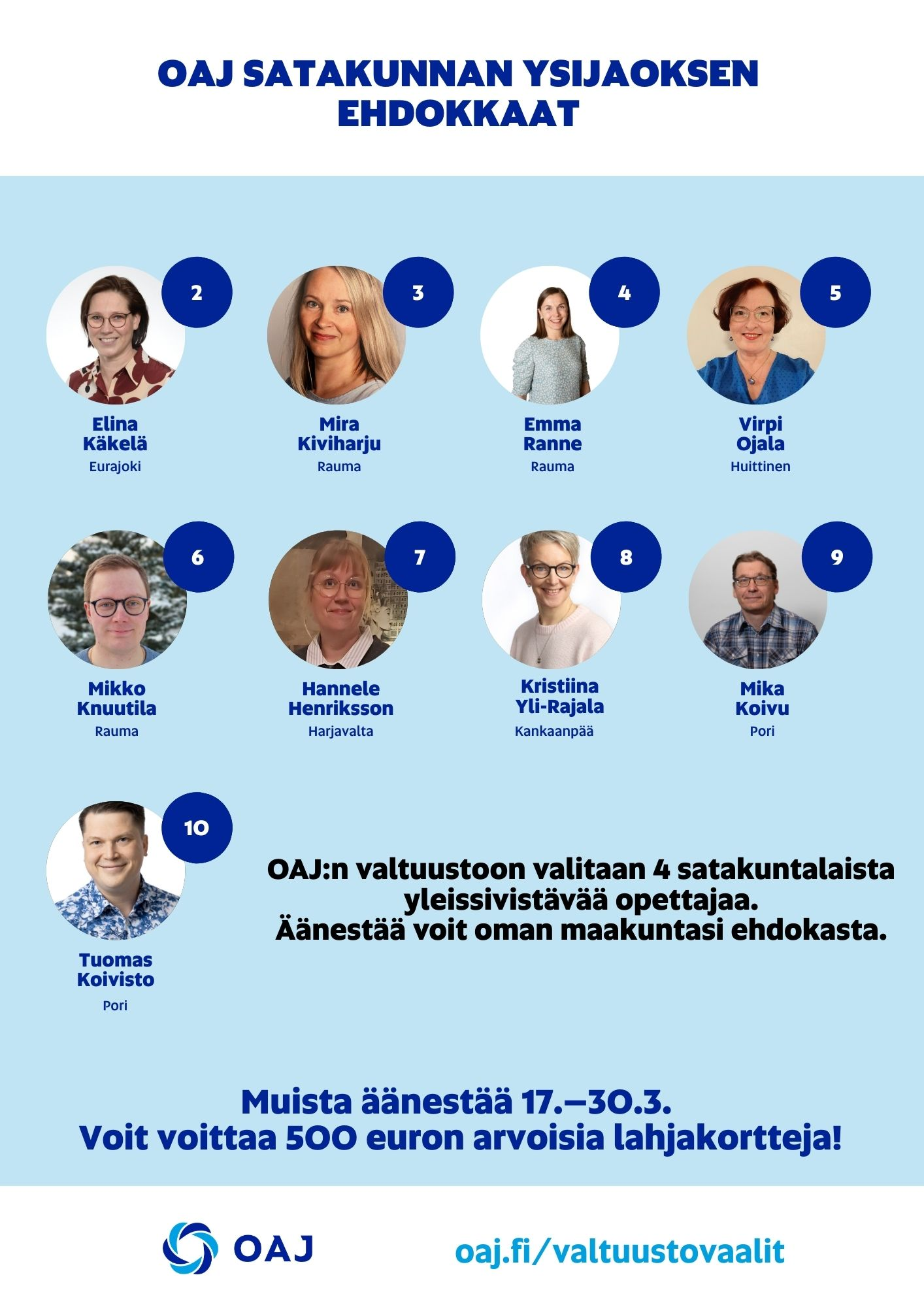 OAJ:n valtuustoon valitaan 4 satakuntalaista yleissivistävää opettajaa. Voit äänestää oman maakuntasi ehdokasta.