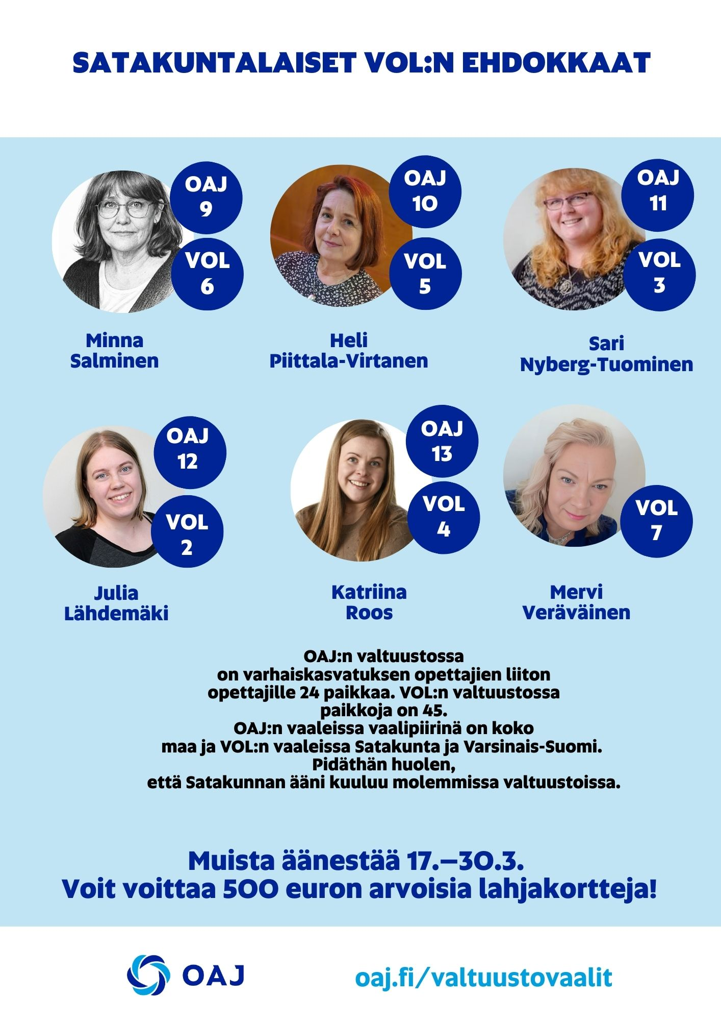 Varhaiskasvatuksen opettajia valitaan OAJ:n valtuustoon 24 ja vaalipiirinä on koko maa. Samaan aikaan käydään myös VOL:n valtuuston vaalit, joissa vaalipiirinä Satakunta ja Varsinai-Suomi. Voit siis kannustaa muitakin äänestämään hyviä satakuntalaisia ehdokkaita, jotka löydät täältä: